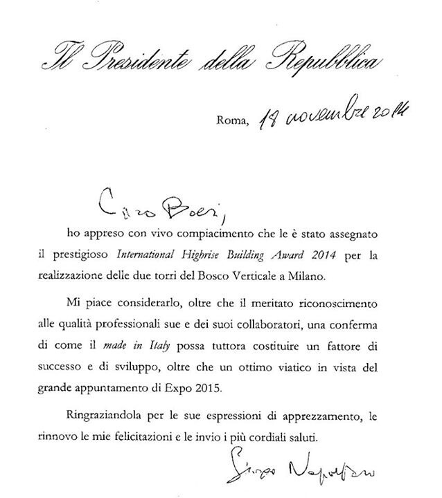 意大利总统给博埃里的信,恭喜垂直森林获奖
